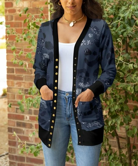 Snap buttons and a bold print accent this casual cardigan. Designed with a set of front pockets and a hint of stretch.
