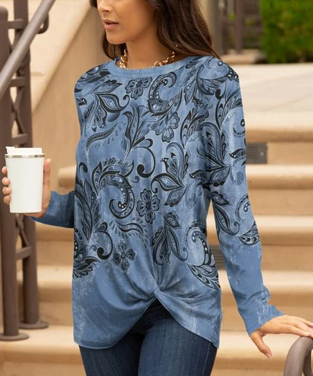Lily | Blue & Black Scroll Floral Knot-Hem Long-Sleeve Tunic – Women & Plus
