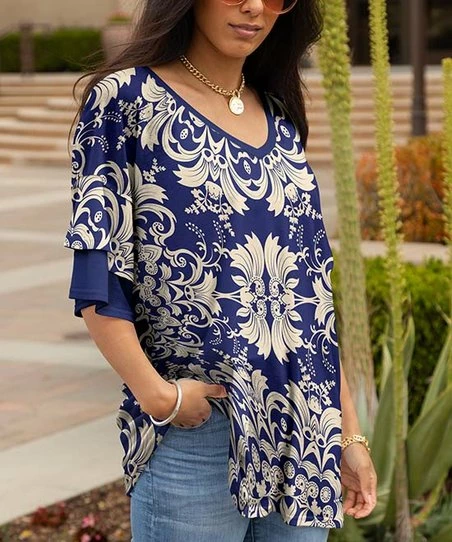 Layered short sleeves and an allover print make this v-neck tunic a true showstopper, and the stretchy knit fabric sets you up for carefree comfort.