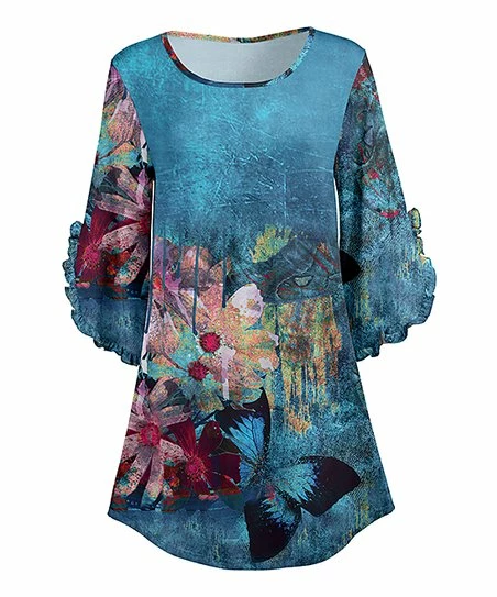 Flaunt your fun personality in this charming-print tunic boasting a flattering flared fit and bold ruffles at the sleeves for an everyday style that stands out.
