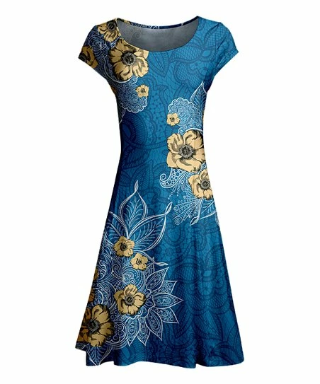 This distinctively patterned dress is cut to accentuate your figure with a breezy flared skirt and charming cap sleeves.