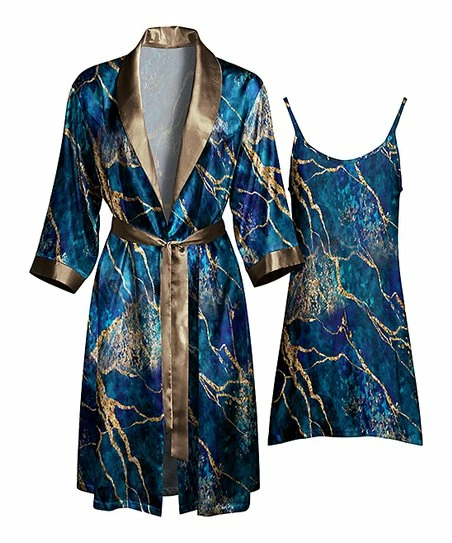 - Includes blue and gold marbled belted satin robe and blue and gold marbled satin camisole nightgown (two pieces total)
