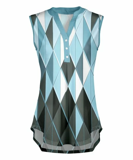 Sleeveless tunic featuring a v-neck with button front, curved hem and argyle pattern.