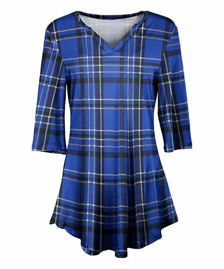 Refresh your wear-everywhere wardrobe rotation with this v-neck tunic featuring stretchy knit fabric and a unique pattern layout. Three-quarter length sleeves offer season-spanning style for maximum pairing potential.