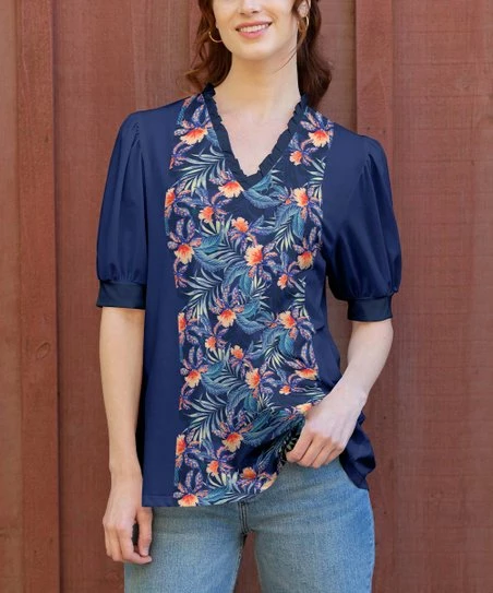 This printed tunic pairs cuffed half sleeves with a ruffle-trim v-neck for a fashionable fit.