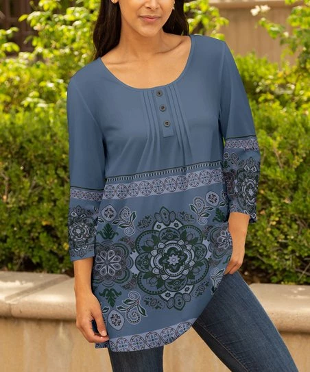 Vibrant three-quarter sleeve tunic with pleats and a trio of buttons enhancing the round neckline.