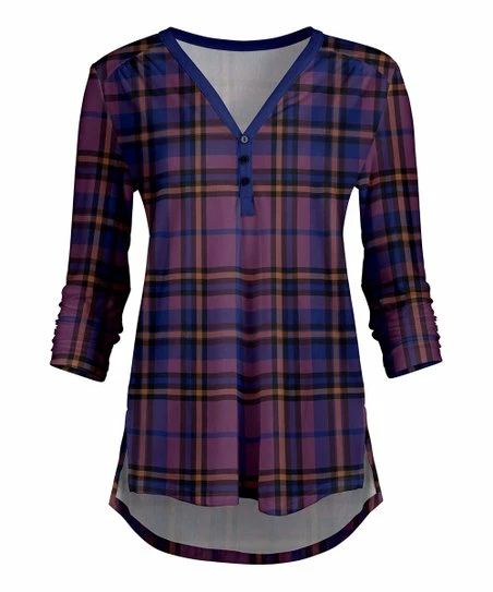 This button-front v-neck tunic has three-quarter sleeves and a hi-low hem for an upscale casual look.