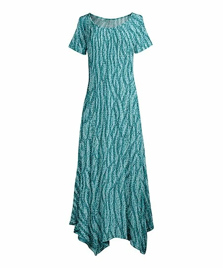 Breeze through your days in this floor-sweeping dress featuring a funky handkerchief hem and casual short sleeves.