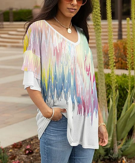 Add color and comfort to your closet with this scoop neck top made from lightweight material and boasting half-sleeves and a vibrant pattern.