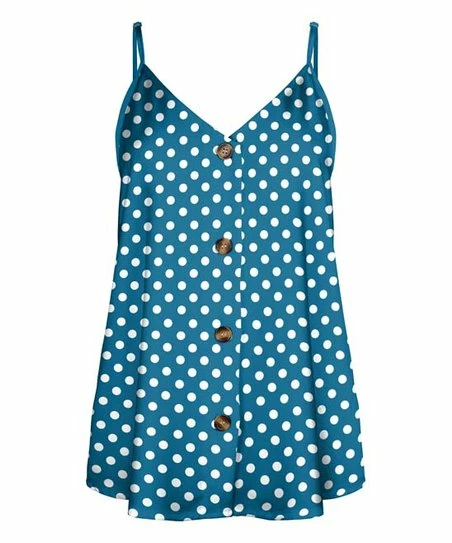 This sleeveless tunic features slinky spaghetti straps, a button-front design and an allover print.