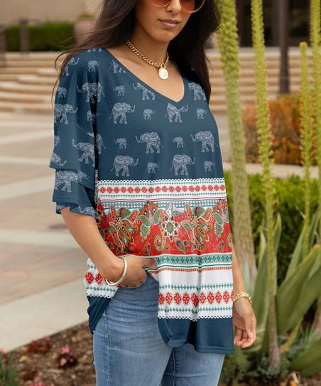 A bold print and flowy, layered sleeves enliven this lightweight v-neck tunic.