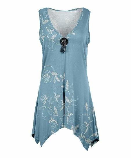 Look lovely as you slip on this sleeveless tunic featuring a draping handkerchief hem and statement pattern.