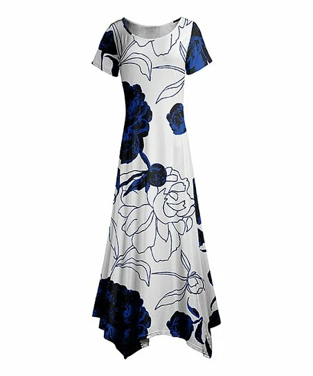 Coast through your day with confidence in this print-splashed maxi dress boasting soft stretch fabric for comfort and a playful handkerchief hem.
