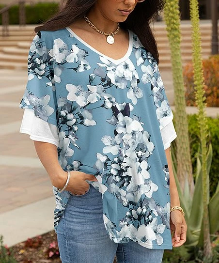 Light, stretch-friendly tunic featuring a lively floral print and plunging v-neckline.