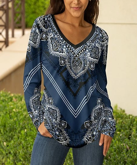 Long-sleeve tunic featuring stretch-blend material and a statement pattern for standout style.
