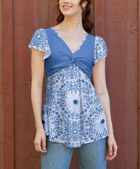 Lily | Blue & White Medallion Center-Knot Ruffle Sleeve Tunic – Women & Plus