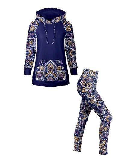 - Includes blue and yellow arabesque longline hoodie and blue and yellow arabesque leggings (two pieces total)
