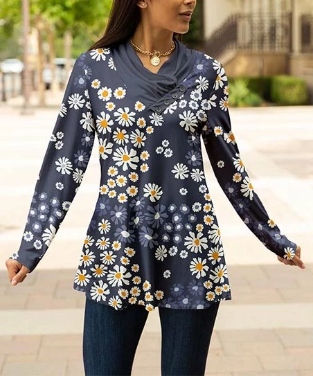 This comfy long-sleeve cowl neck tunic features a bold print and a hint of stretch that makes it great for everyday wear.