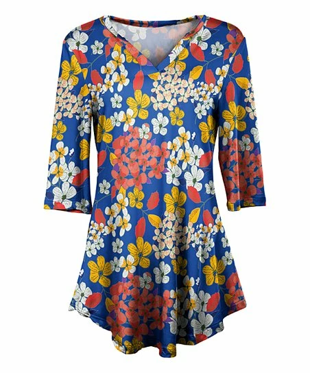Lily | Blue & Yellow Floral Three-Quarter Sleeve V-Neck Tunic – Plus