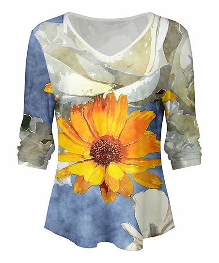 Face shifting temps in artsy fashion wearing this v-neck tee that readies you for the weather with stretchy fabric and three-quarter sleeves.