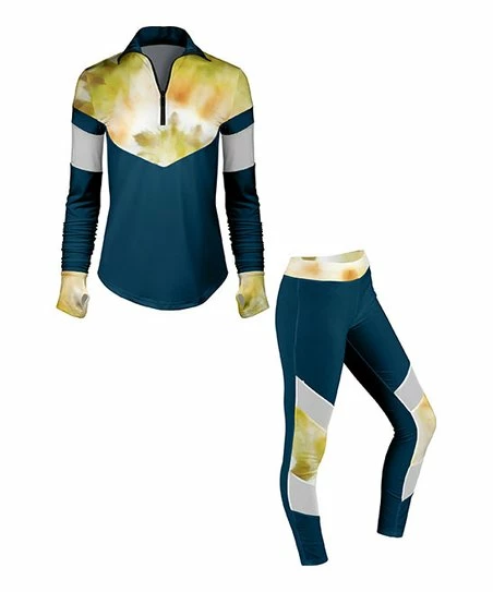 - Includes blue and yellow tie-dye color block quarter-zip pullover and matching leggings (two pieces total)