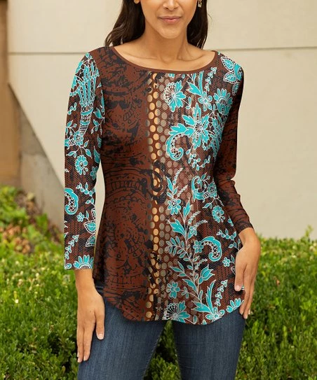 This chic top features a figure-flattering flared hem with a boatneck collar and long sleeves.