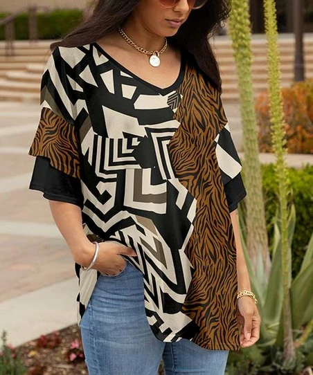 Glide through your day off with carefree expression in this roomy v-neck tunic polished with breezy ruffled sleeves.