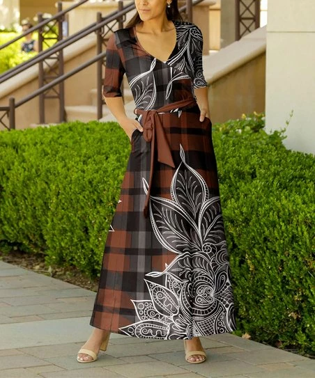 Printed maxi dress featuring a tie at the waist and a surplice neckline. Side pockets.