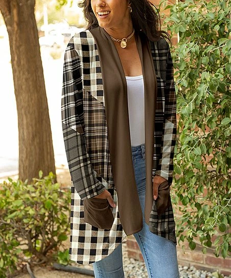 Layerable open cardigan made from stretch-infused fabric with handy front pockets.