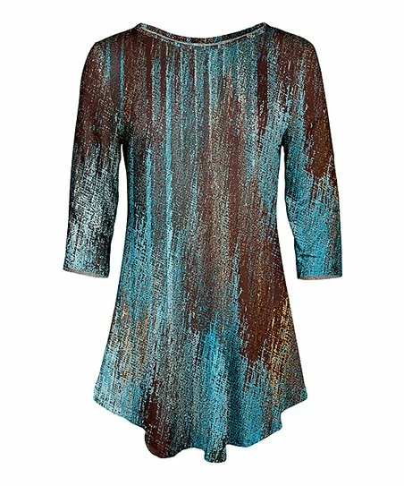 A curved hem and three-quarter-length sleeves add sweet appeal to this colorful tunic. Stretch-enhanced fabric feels soft against your skin.