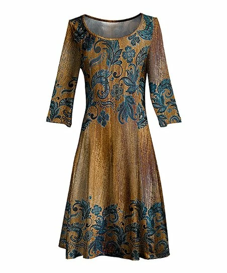 Make a statement in this swingy A-line dress designed with a boatneck, three-quarter sleeves and a vibrant print.