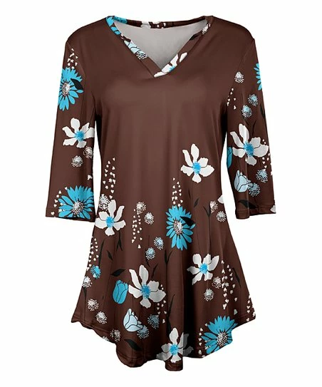 Refresh your wear-everywhere wardrobe rotation with this v-neck tunic featuring stretchy knit fabric and a unique pattern layout. Three-quarter length sleeves offer season-spanning style for maximum pairing potential.