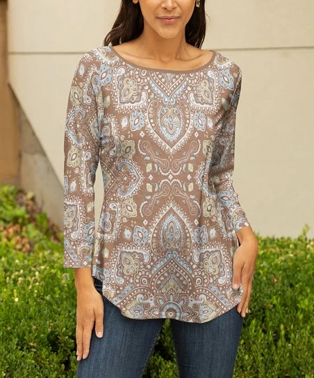 This chic top features a figure-flattering flared hem with a boatneck collar and long sleeves.