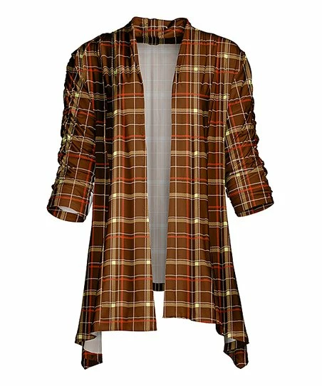 Dress up your contemporary style with the bold plaid print and the sweeping sidetail hemline of this cardigan that gently drapes over your figure for a comfortable fit.
