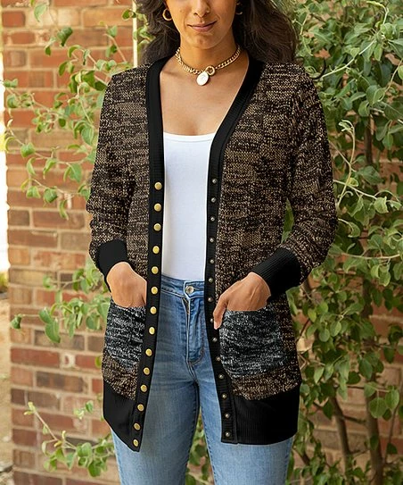 Layer your look with this stretch-enhanced cardigan designed with an allover pattern in a neutral hue that offers plenty of mix-and-match potential.