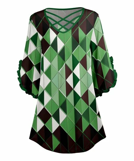 Strap details lend a trendy touch to the neckline and flowy ruffled three-quarter length sleeves add a graceful finish to this relaxed tunic.