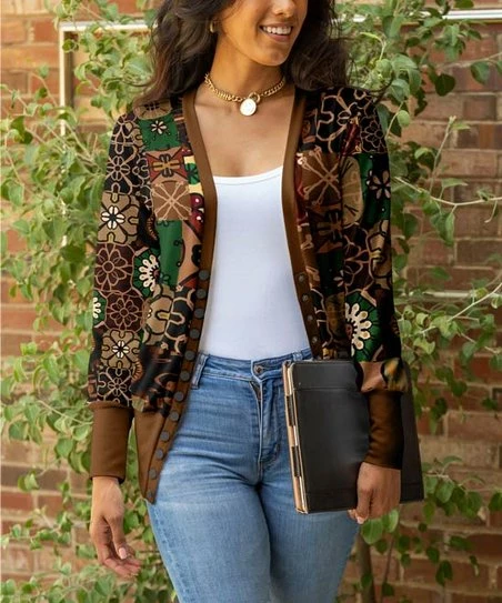 Whether you wear it snapped up or open, this comfy stretch cardigan emboldens your ensembles with an artsy print offset by solid contrast trim.