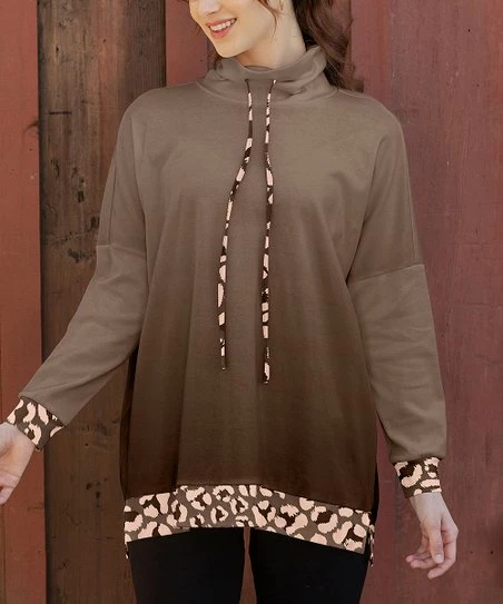 This top features leopard-patterned trim and a drawstring cowl neckline. Stretch-enhanced blend.