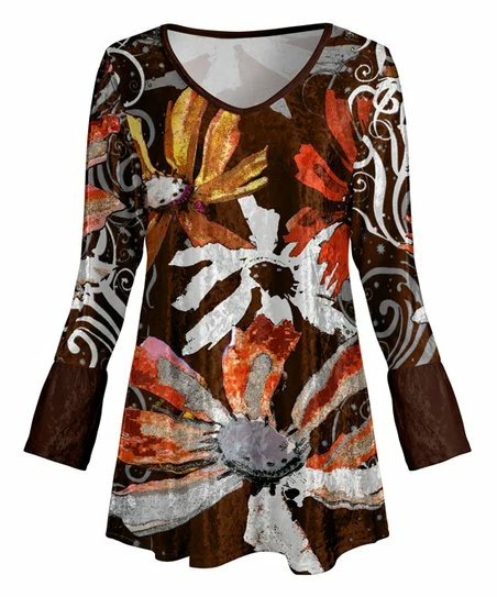 Flaunt breezy style in this tunic that features a colorful motif and a scooping neckline. Its velvet texture and stretch-enhanced blend offer all-day comfort.