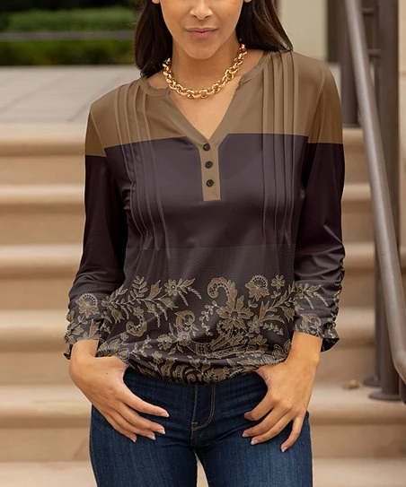 A notch neck leading to a button front design adds personality to this soft and stretchy tunic sporting an eye-catching mixed floral pattern.