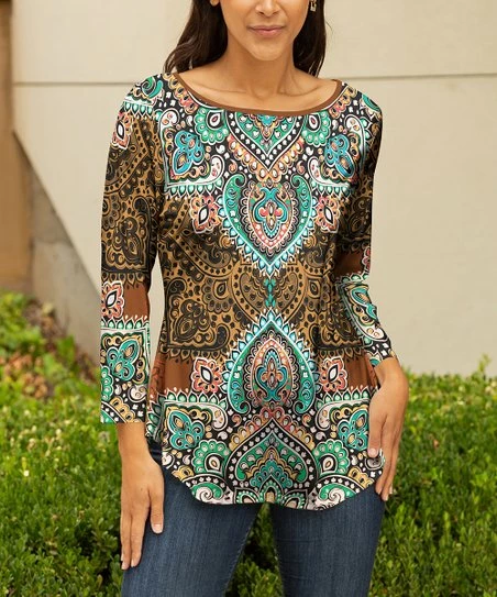 This chic top features a figure-flattering flared hem with a boatneck collar and long sleeves.