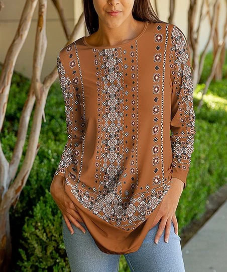 Stretch-enhanced tunic featuring a stand-out print and breezy long sleeves.