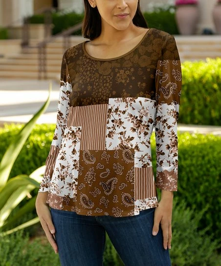 Lily | Brown & White Patchwork Floral Boatneck Top – Women