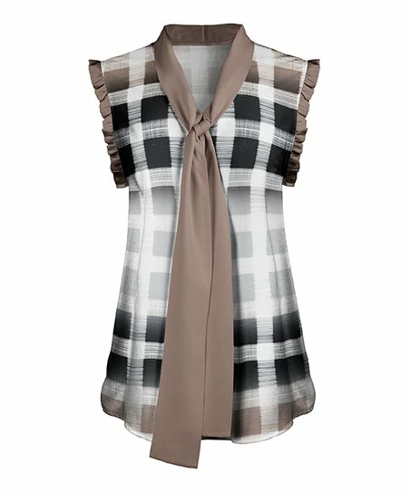 With ruffled short sleeves, a stylish tie-neck design and comfortable stretch-infused fabric, this tunic is a casual wardrobe essential.