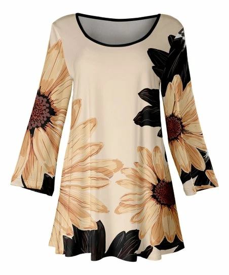 Elevate your ensemble with this boldly printed tunic featuring three-quarter sleeves and a flowy fit.