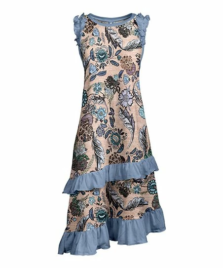 A sleeveless A-line dress featuring a layered asymmetrical hem and a floral print. Finished with ruffle accents.
