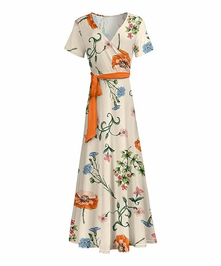 A surplice bodice and belted hem give this maxi dress a flattering fit. Short sleeves for warm weather comfort.