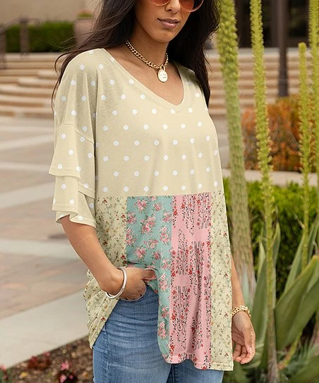Layered bell sleeves add movement to this tunic while playing up the romance of its patchwork floral accents.