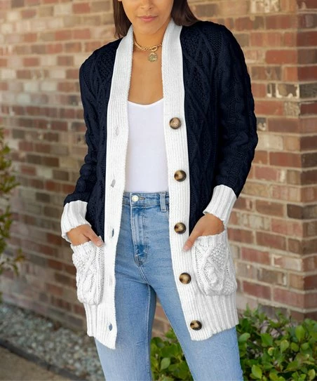 When you need an extra layer, reach for this cozy cardigan featuring drop pockets and two-tone style. It’s got buttons down the front so you can block chilly breezes.