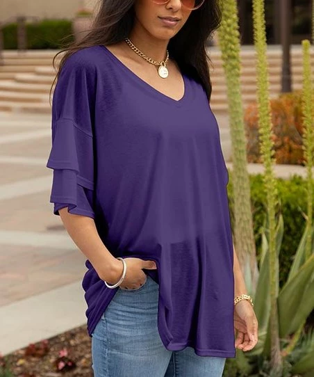 Expand your wardrobe options with this flowy tunic that boasts ruffled accents and a solid hue that invites accessorizing.